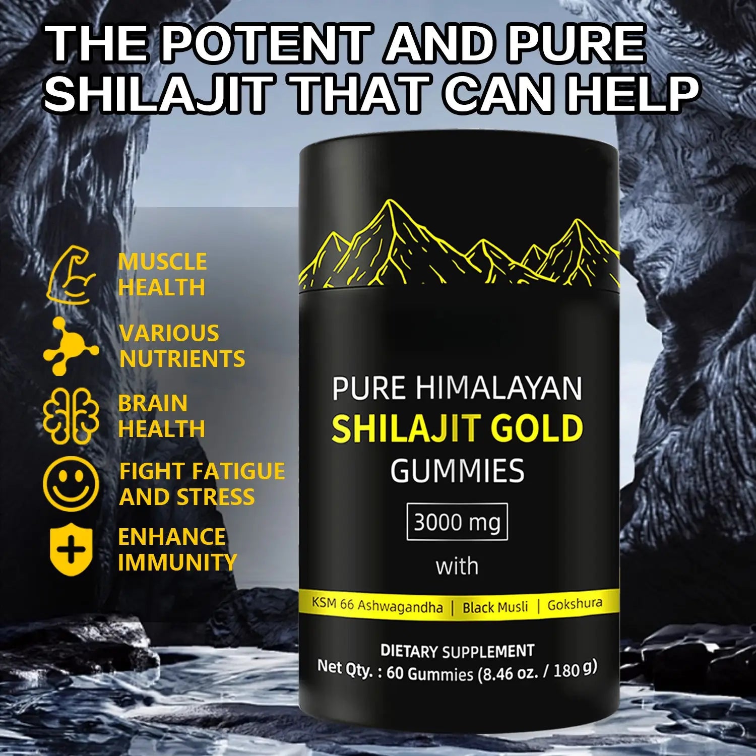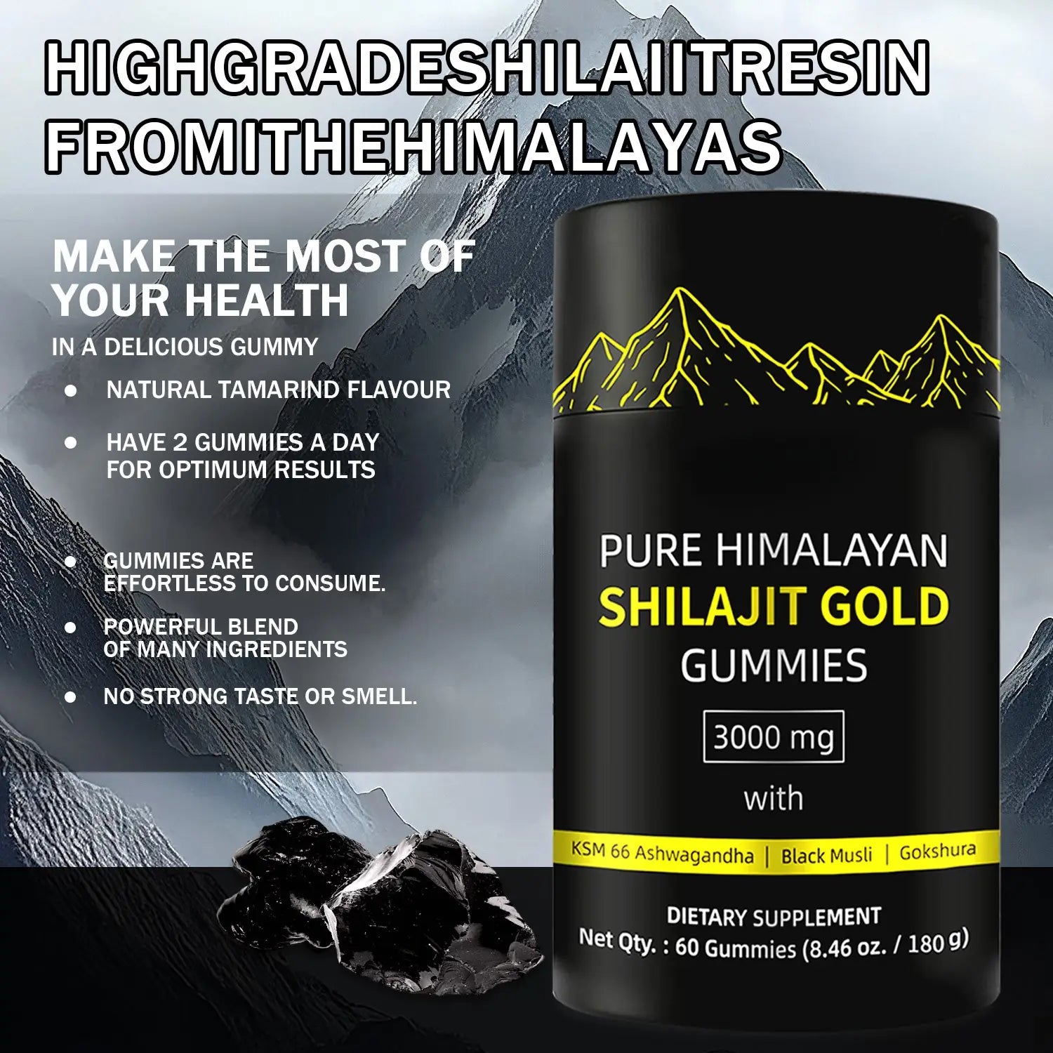 Step into a world of renewed vitality with WISHCA Himalayan Shilajit Gold Gummies, featuring the treasured natural substance sourced from the majestic Himalayas! This dark-brown, precious exudate, formed by the gradual decomposition of plants by microorganisms, is rich in Fulvic Acid, Humic Acid, and over 80 different minerals.